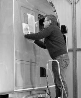 - Réalisation de lettrages publicitaires sur camionnettes, camions et voitures de société, bateaux, remorques.